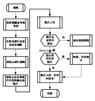 在派出所安装证件拍摄系统终端:智能拍摄终端操作特别简单,照相过程类似于照镜子的动作,群众站在设备前,设备瞬间根据人物身高将镜头自动调节到合适的高度,取景屏幕也调整到人物视线刚好平视的高度,整个拍摄过程在友好的语音提示下进行,群众只需面对屏幕调节好姿势表情即可,就像照镜子那么简单。拍摄到满意照片以后,设备通过公安网将原图上传到省厅云端服务中心,云端对原图裁剪、优化后,将合格相片发回到派出所终端,终端即可获得办证所需的合格电子相片,提交到人口信息系统中办证。所有派出所照相设备的操作在统一云端的指导下进行,派出所民警不需对照片质量把关,只需作适当引导。同时,云端检测中心将按照公安部要求裁剪优化处理后的每一份相片,进行适当的加密处理,以确保每一张合格的相片均是由云端处理中心给出的。另外,由于采用了原图检测,检测中心给出的合格相片就是最终进行制证的相片,制证前无需对采集到的图片再次进行批量处理就可以和后台制证设备实现人物面部亮度,色彩等高度匹配。